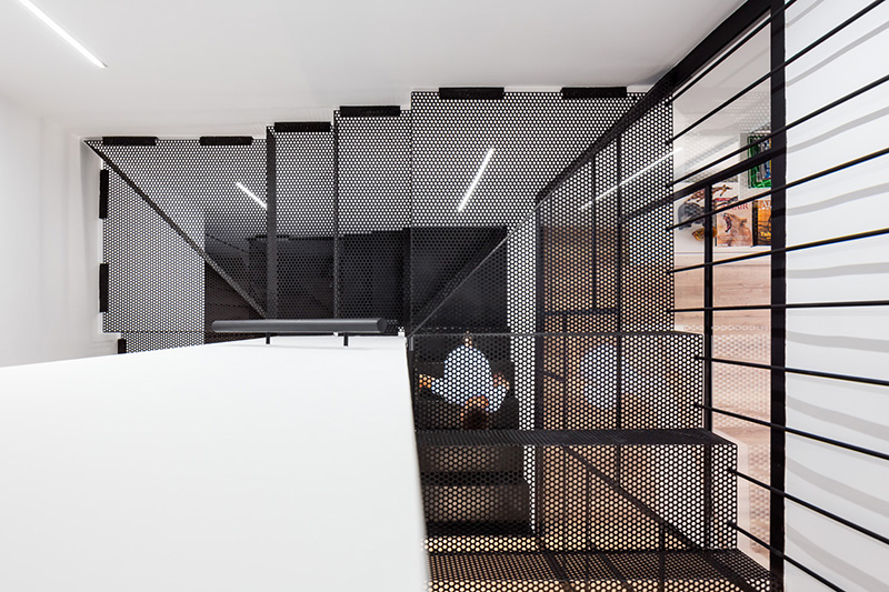 L’edificació està distribuïda en tres plantes connectades a través d’una escala de xapa plegada i perforada.