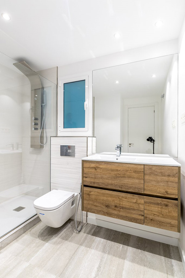 La localització dels dos banys i de la cuina s’ha mantingut en la seva posició original per a aprofitar els desguassos existents. Els amplis finestrals al pati de poma s’han estès a través de la introducció de diversos elements de l’antiga distribució aportant una excel•lent lluminositat a la zona de dia.