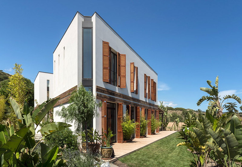 The ground floor of the house contains the living area, an open-plan space measuring 100 m² that includes a living room, a kitchen and a painting studio. It is connected to the outside through a pergola that leads to an outdoor kitchen and a swimming pool.